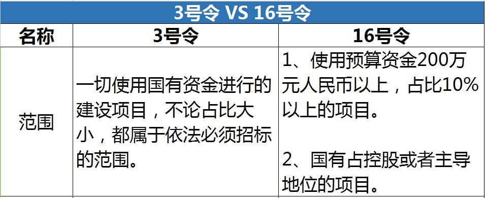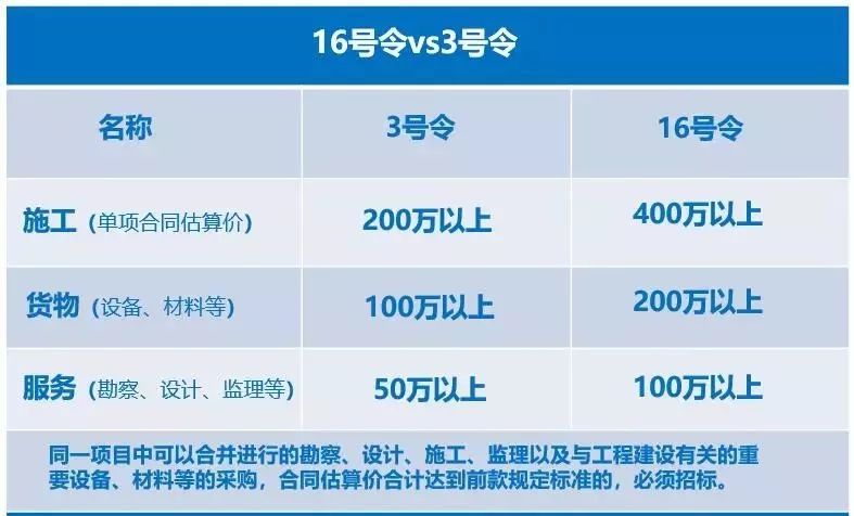 與原3號(hào)令相比提高了一倍。同時(shí),取消了“單項(xiàng)合同估算價(jià)低于上述規(guī)定的標(biāo)準(zhǔn),但項(xiàng)目總投資在3000萬元人民幣以上”的規(guī)定。